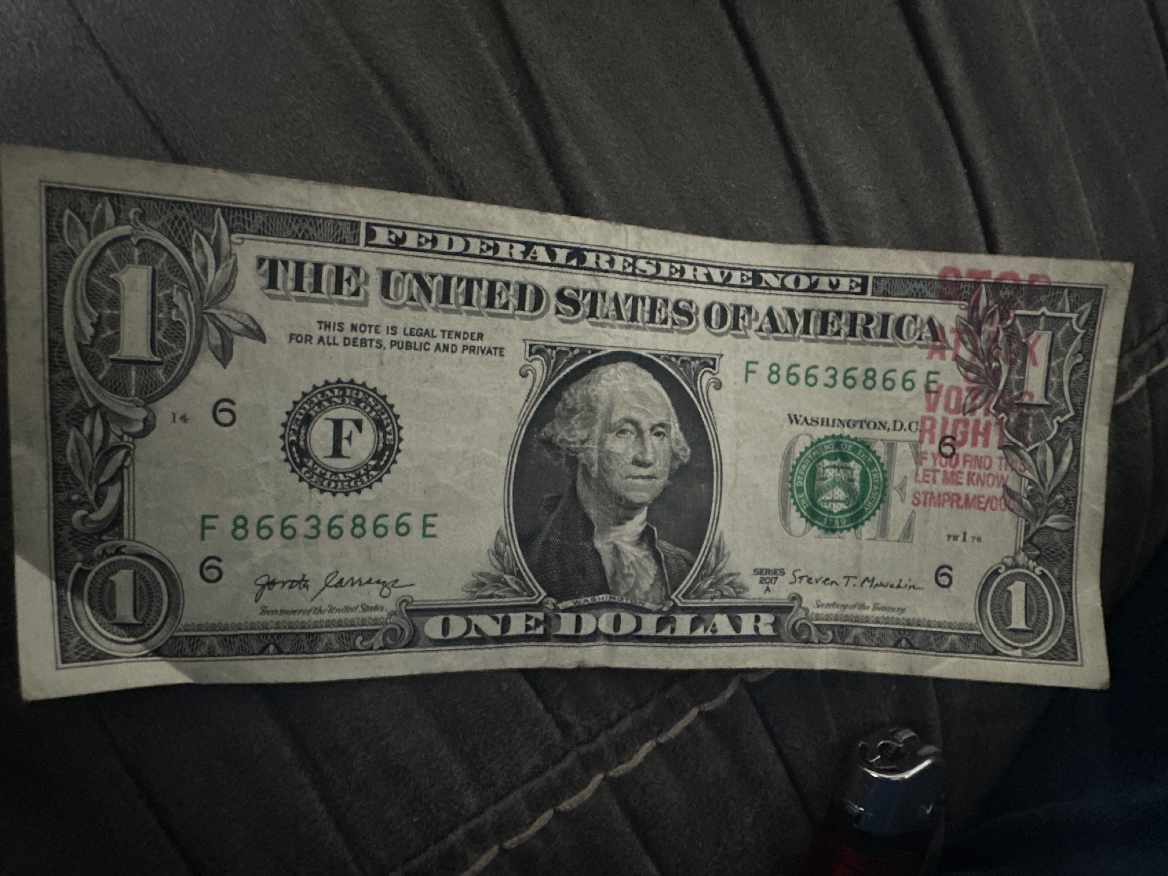 2/15/2024 | Atlanta, GA | My mom gave me 40 dollars for gas. One of the 20 dollar bills have a stamp that says "CORPORATIONS ARE NOT PEOPLE. If you find this let me know STMPRME/2000" | 1 | View Bills |