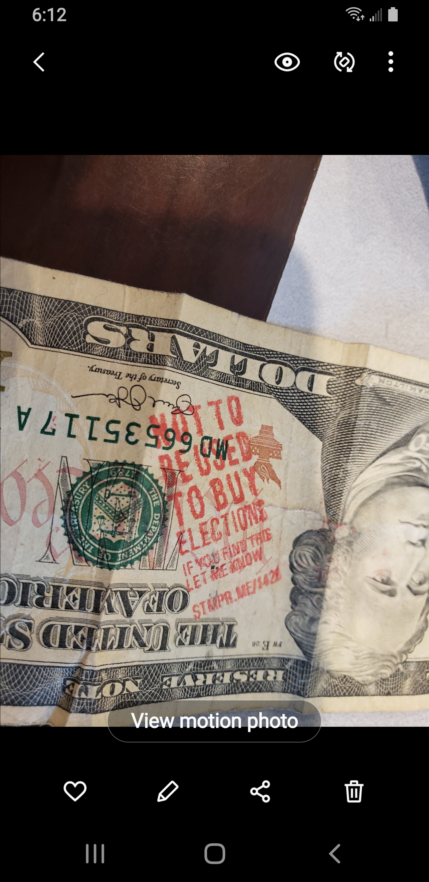 | 10/22/2019 | Wall Township, NJ | I bought something with a $20 bill and got this stamped $10 bill in return | 1 | |