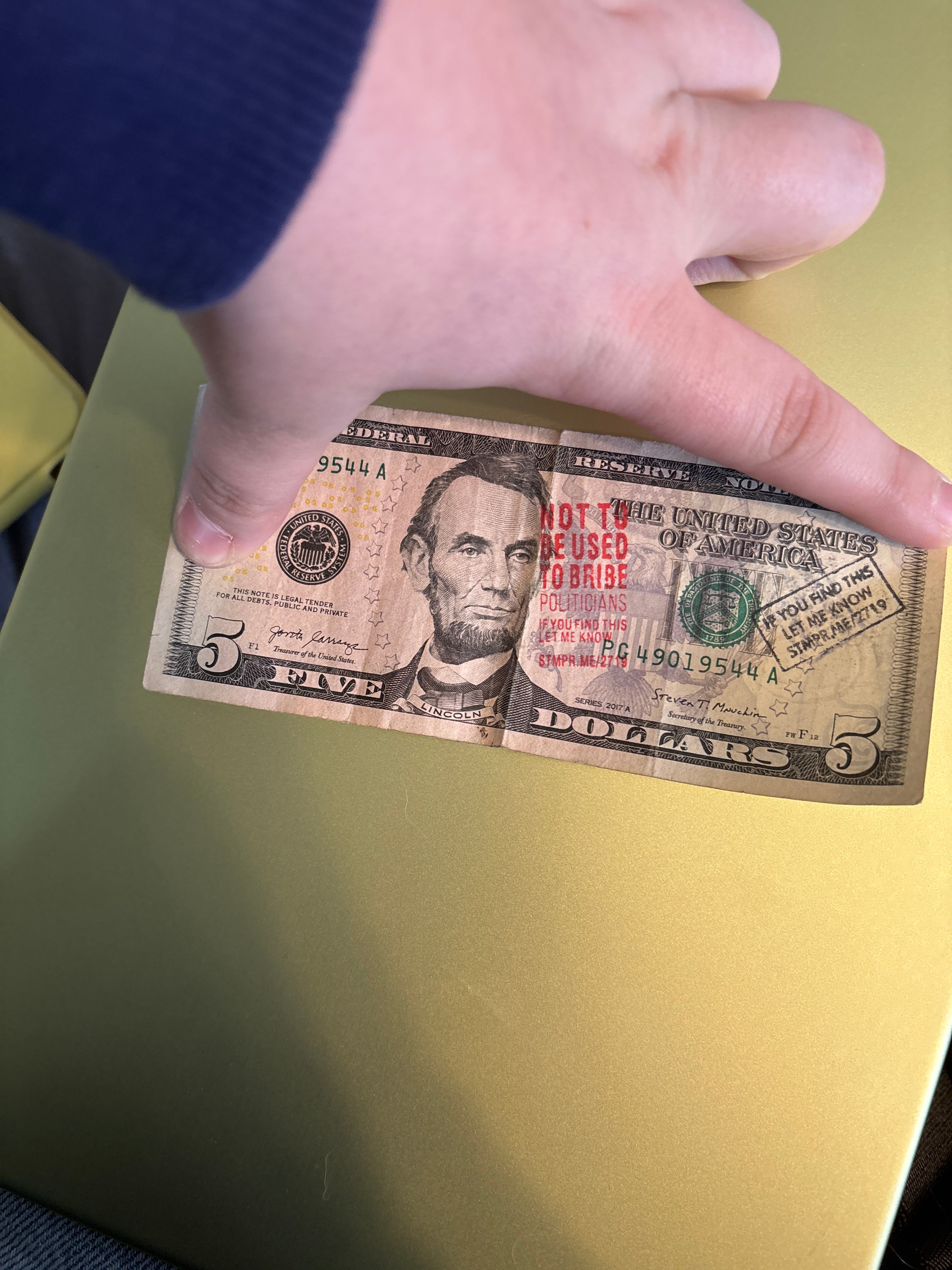1/7/2025 Candia, NH I was working and after we closed I counted the drawers, I spotted the 5 dollar bill and snapped a picture to look at it later. 1