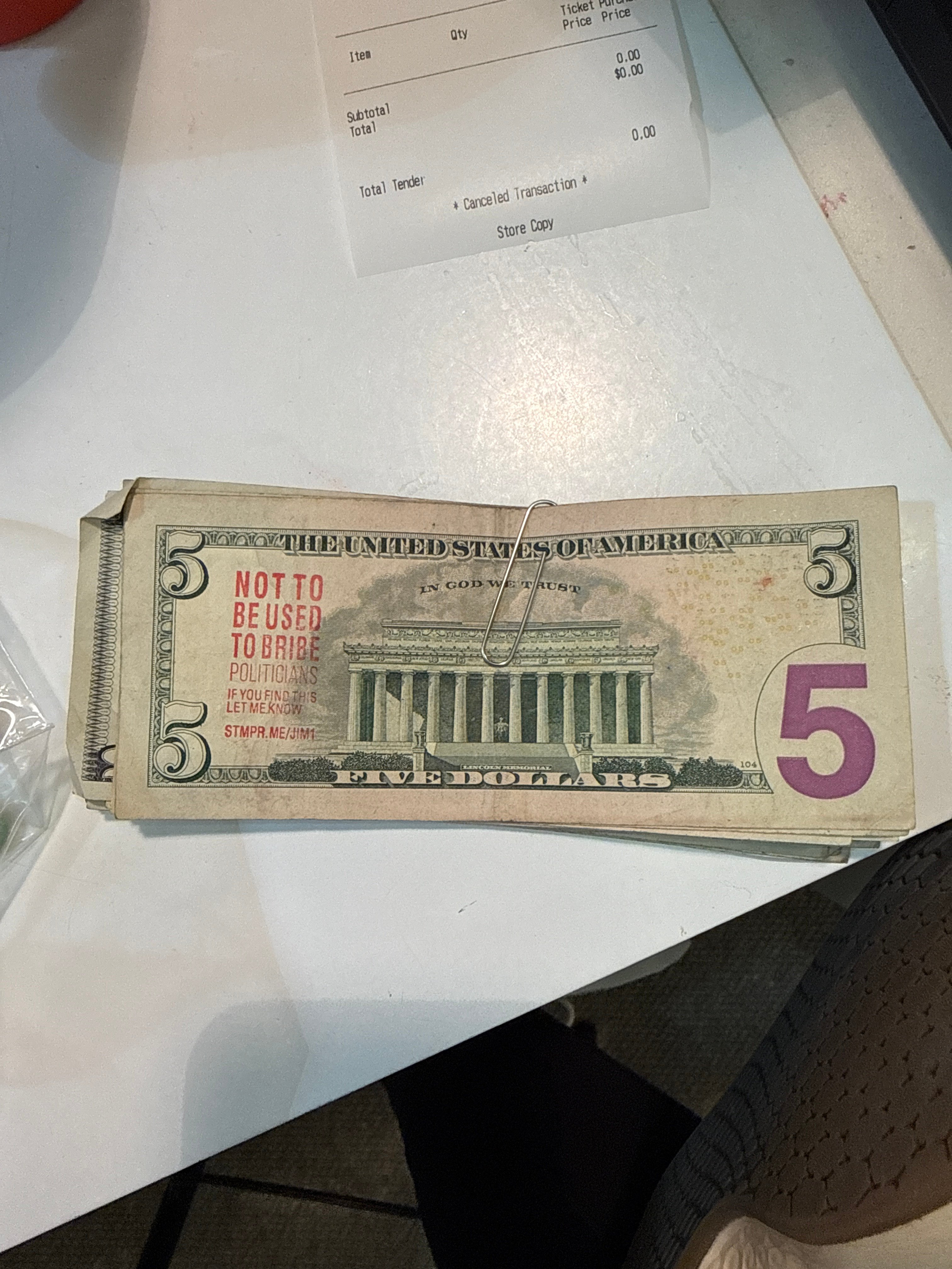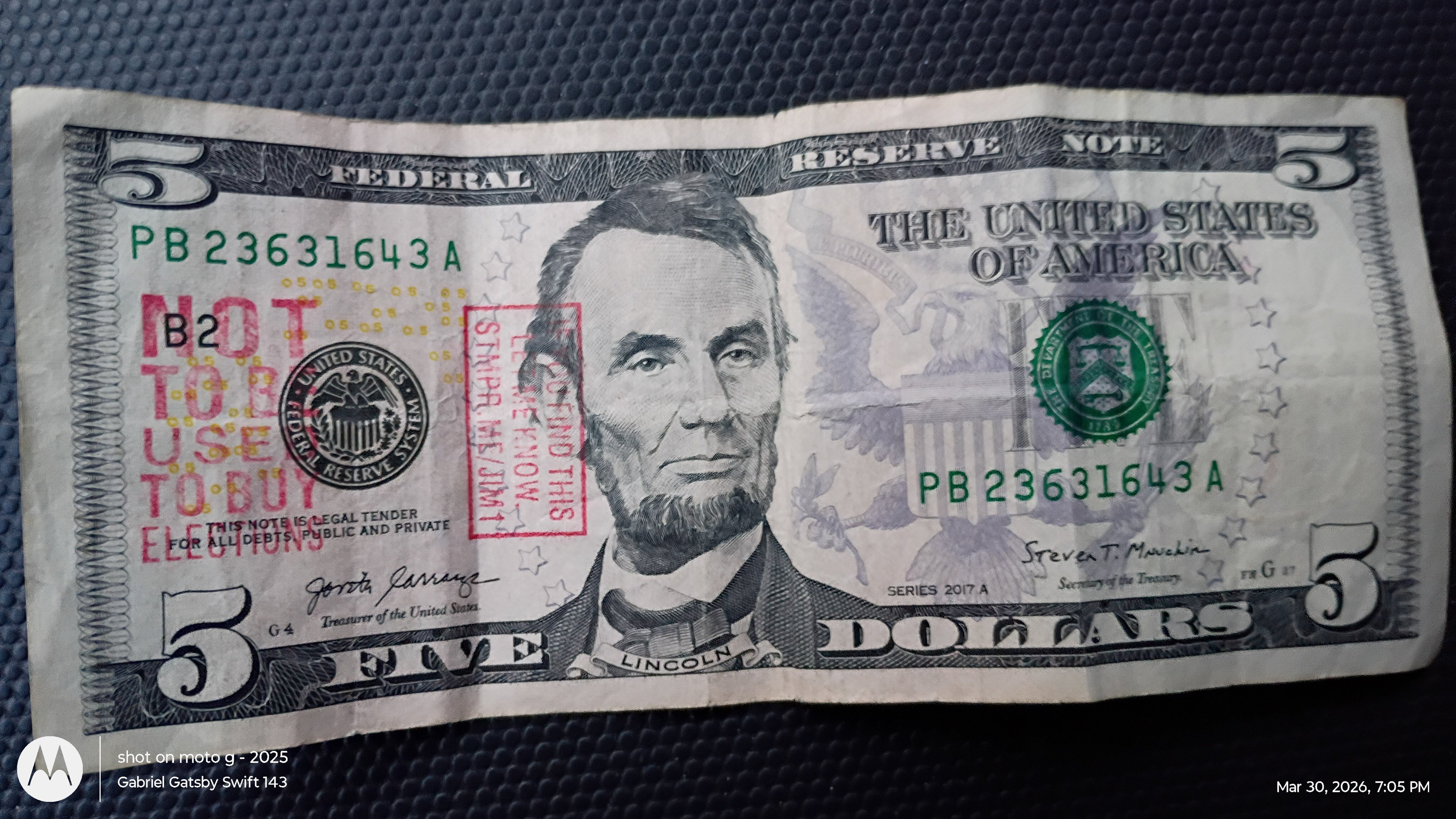 | 4/1/2026 | Chicago, IL | I was after school with my friends going to play soccer but we were hungry I brought $25 I bought sushi a drink and 2 donuts and I gave her the twenty and the lady gave me a 3 dollars and a 5 dollar bill back and the 5 dollar bill had that written on it and it’s been 7 days and I tried using it yesterday at target and it didn’t work so I read what it had written on it and it led me here. | 1 | |