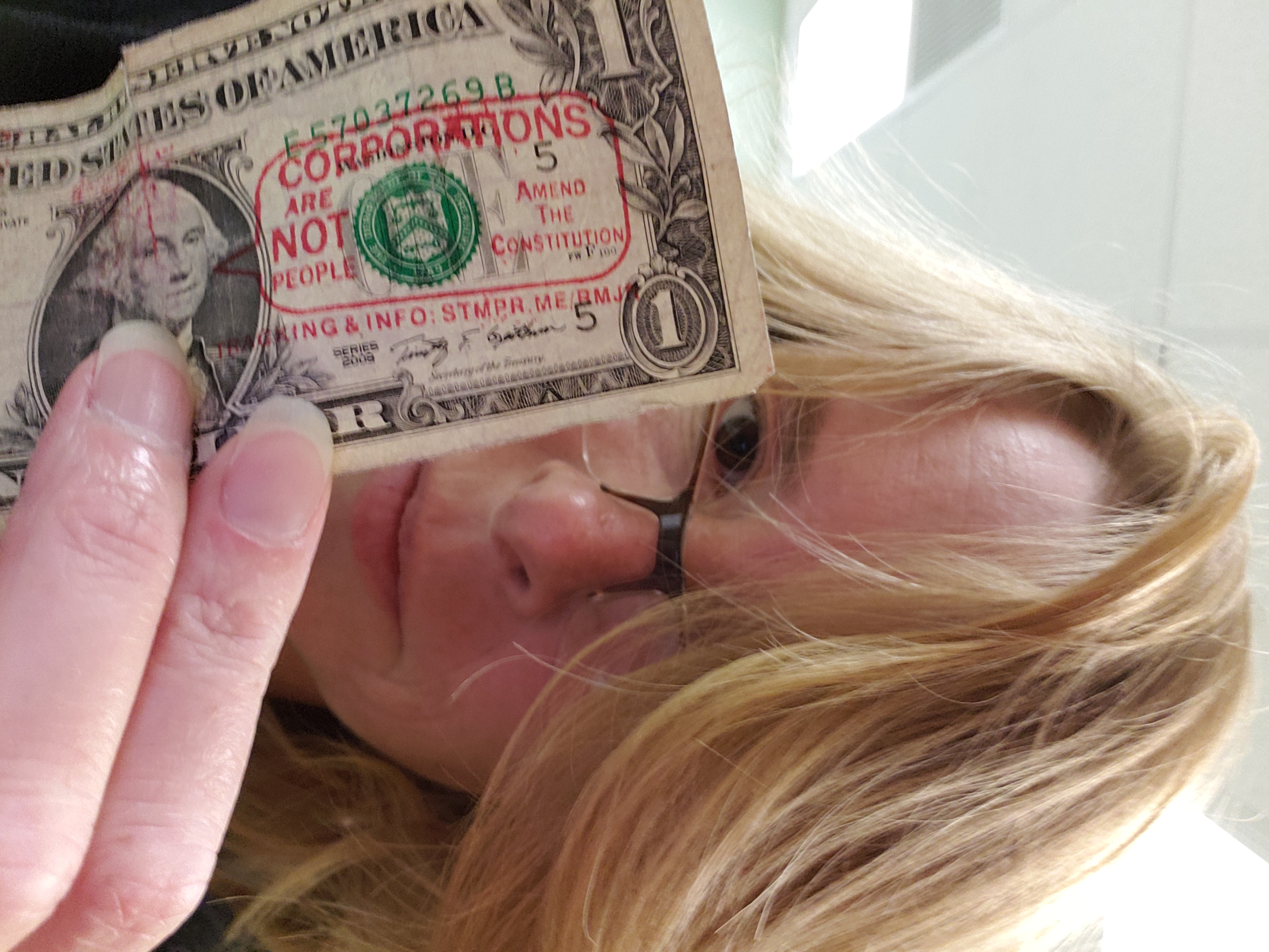 | 6/12/2021 | Show Low, AZ | Not sure when I acquired the bill, but I was about to spend it when I saw the stamp! I live in a largely conservative community and I’m very much aligned with your mission. Thanks for spreading the message to stamp out big money from politics and protect the integrity of the vote. | 1 | |