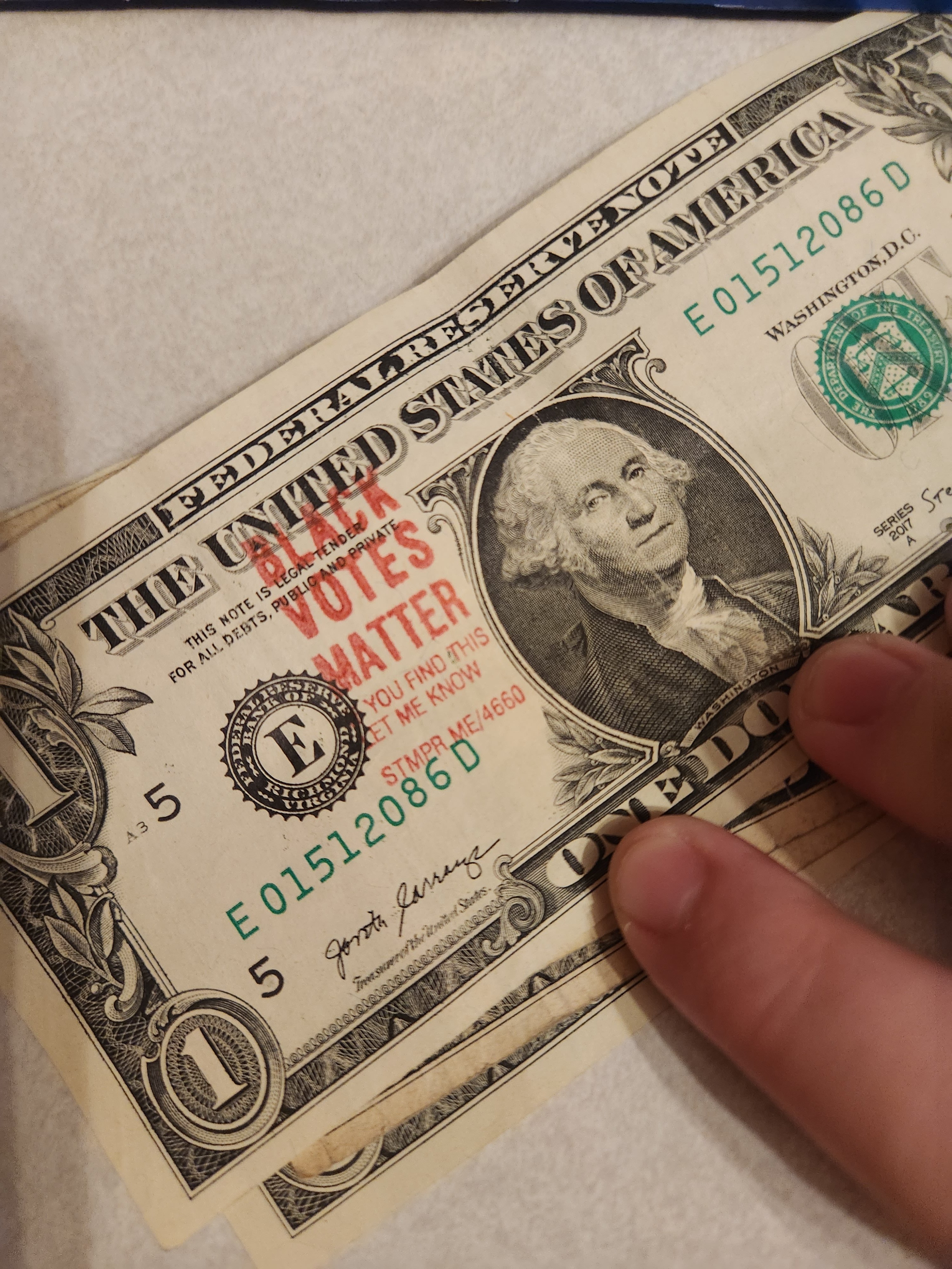 | 1/21/2025 | Waterloo, IA | My mom handed me a dollar bill to set as tip for a waiter and it had this stamp | 1 | |