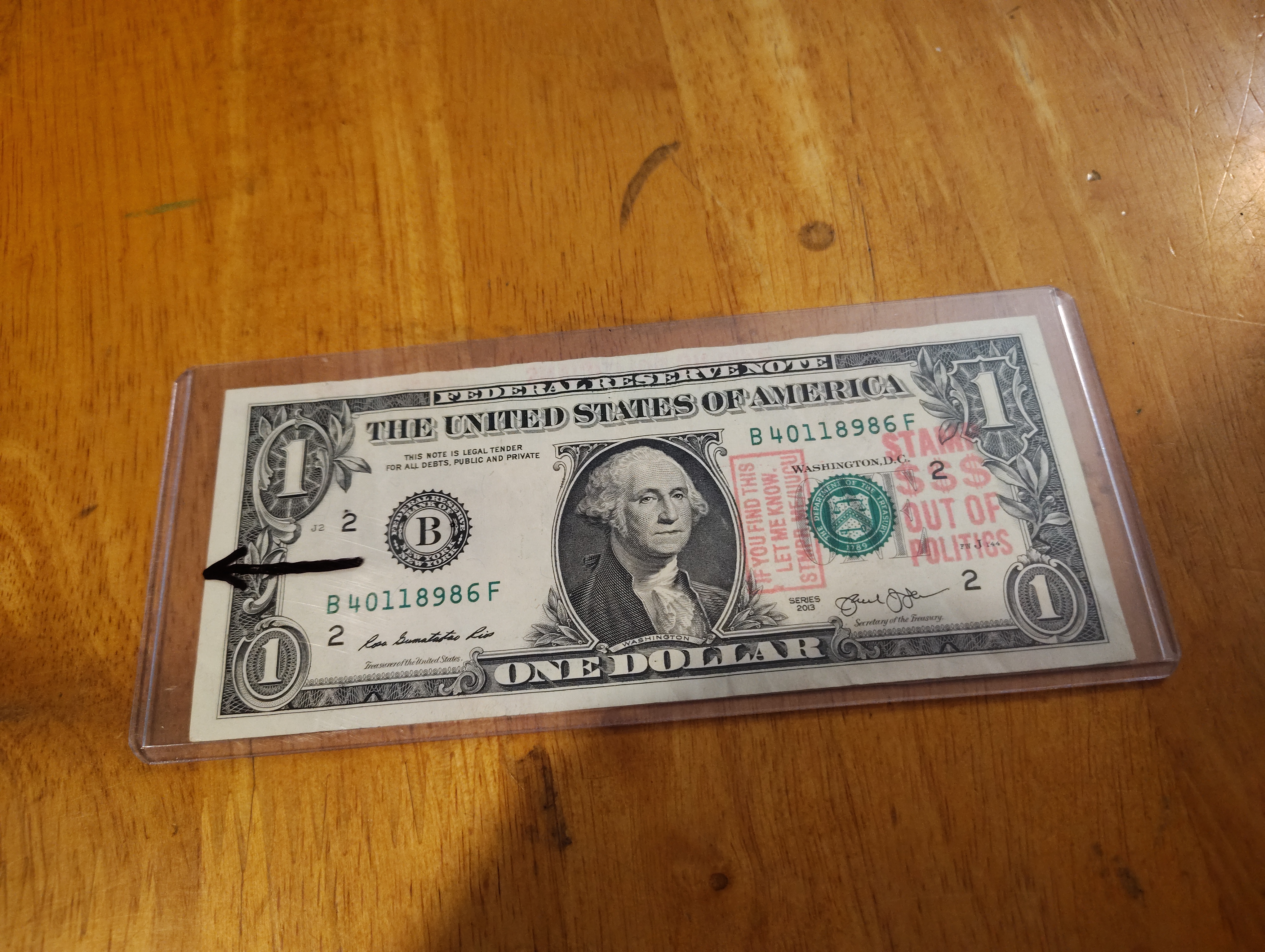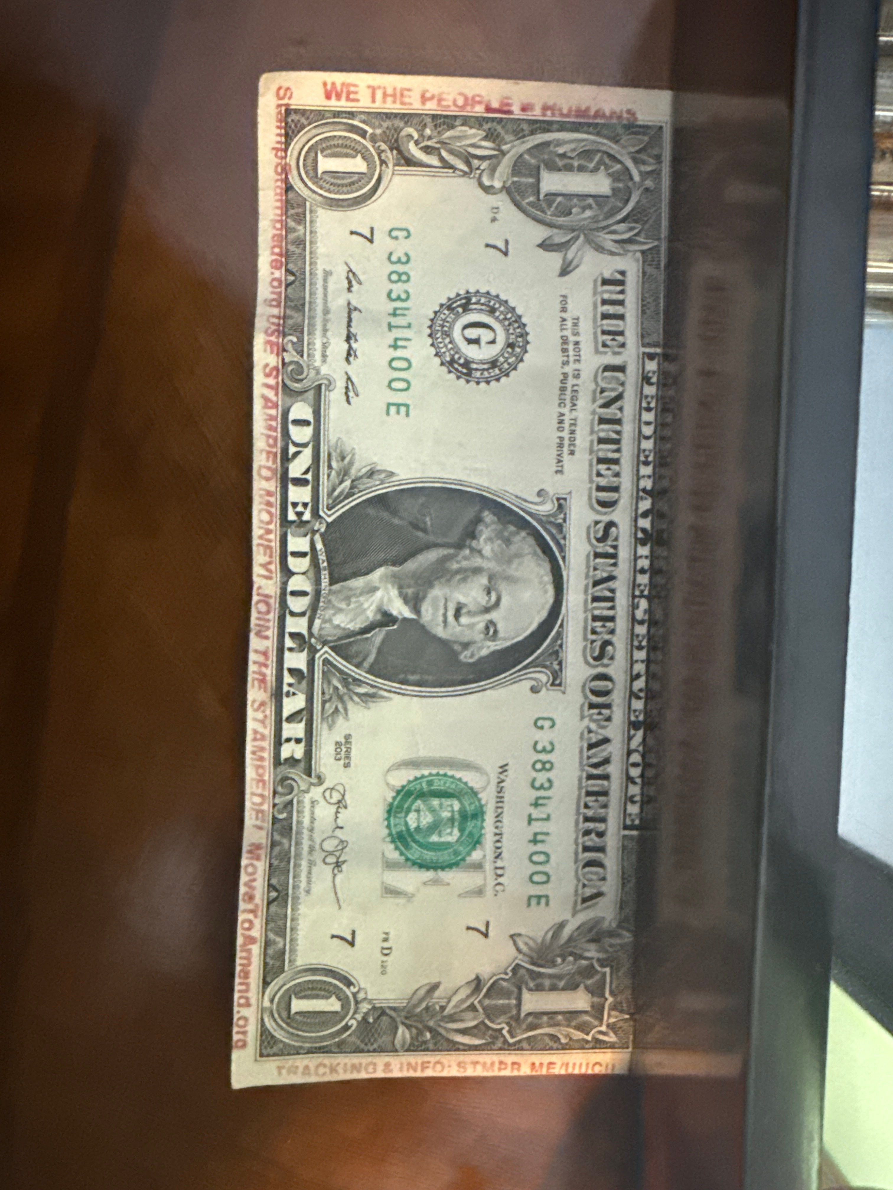 | 5/21/2018 | Peoria, IL | Uhhh i was at the gas station and I decided to get a drink cause i was pretty parched ya feel. So 2 days later I check my wallet to see my current pocket money and saw a stamped dollar bill. | 1 | View Bills |
