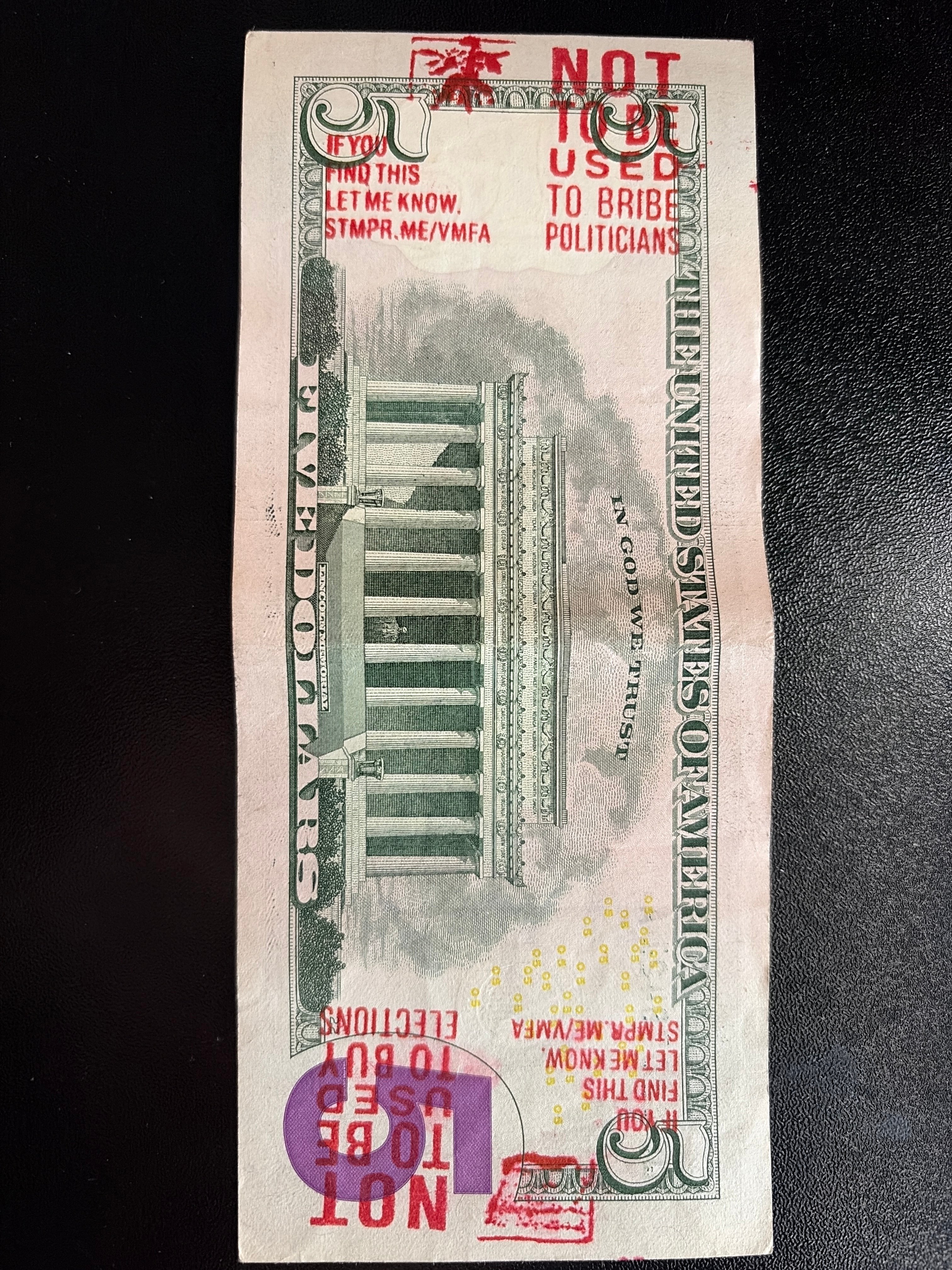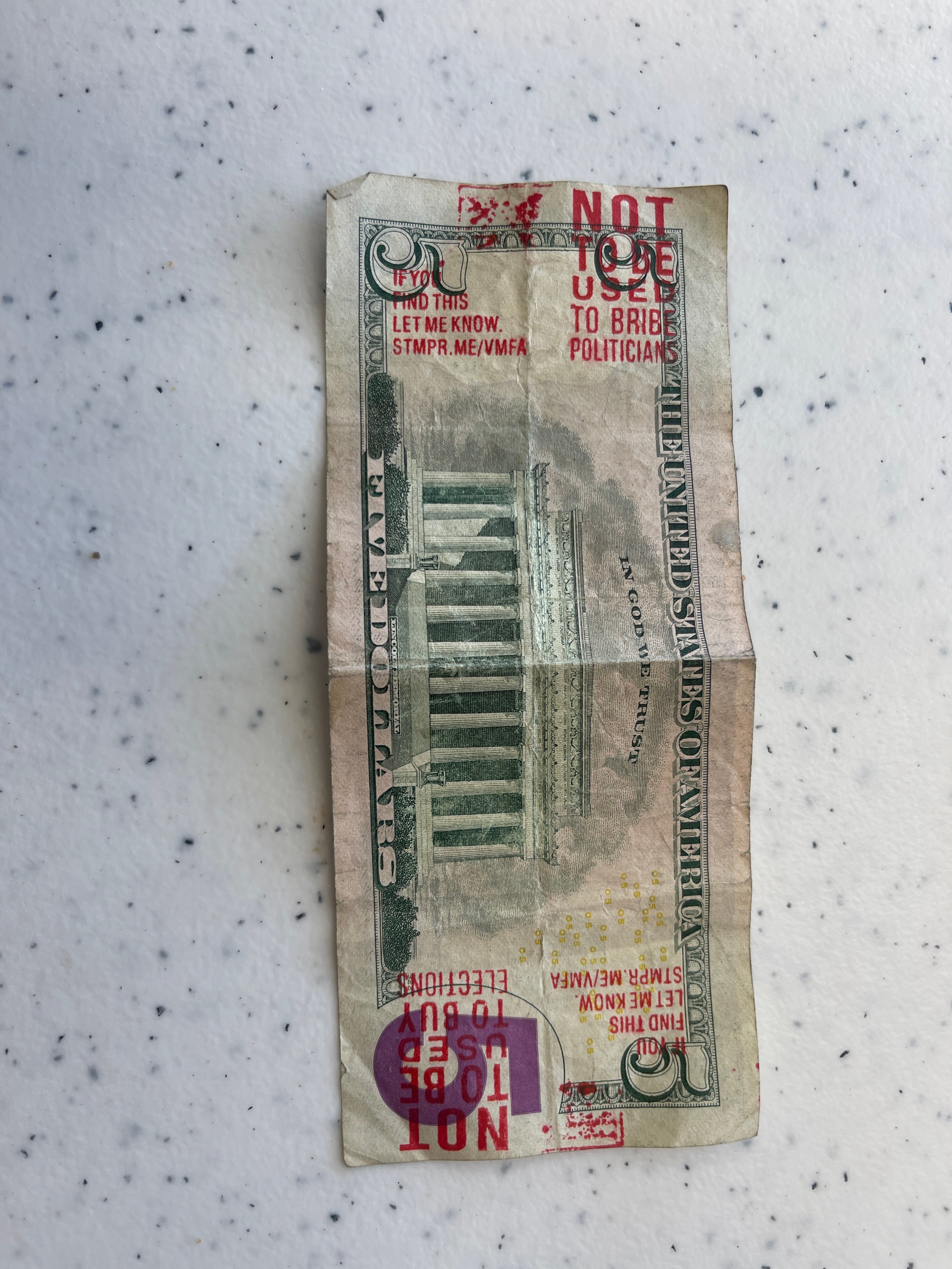 | 2/11/2026 | St. Louis, MO | I am a teacher who is running our school store in honor of Black History Month. A student used a $5 bill with this stamp to buy something today. My students were interested to find out if this was a real bill and a real website. | 1 | |