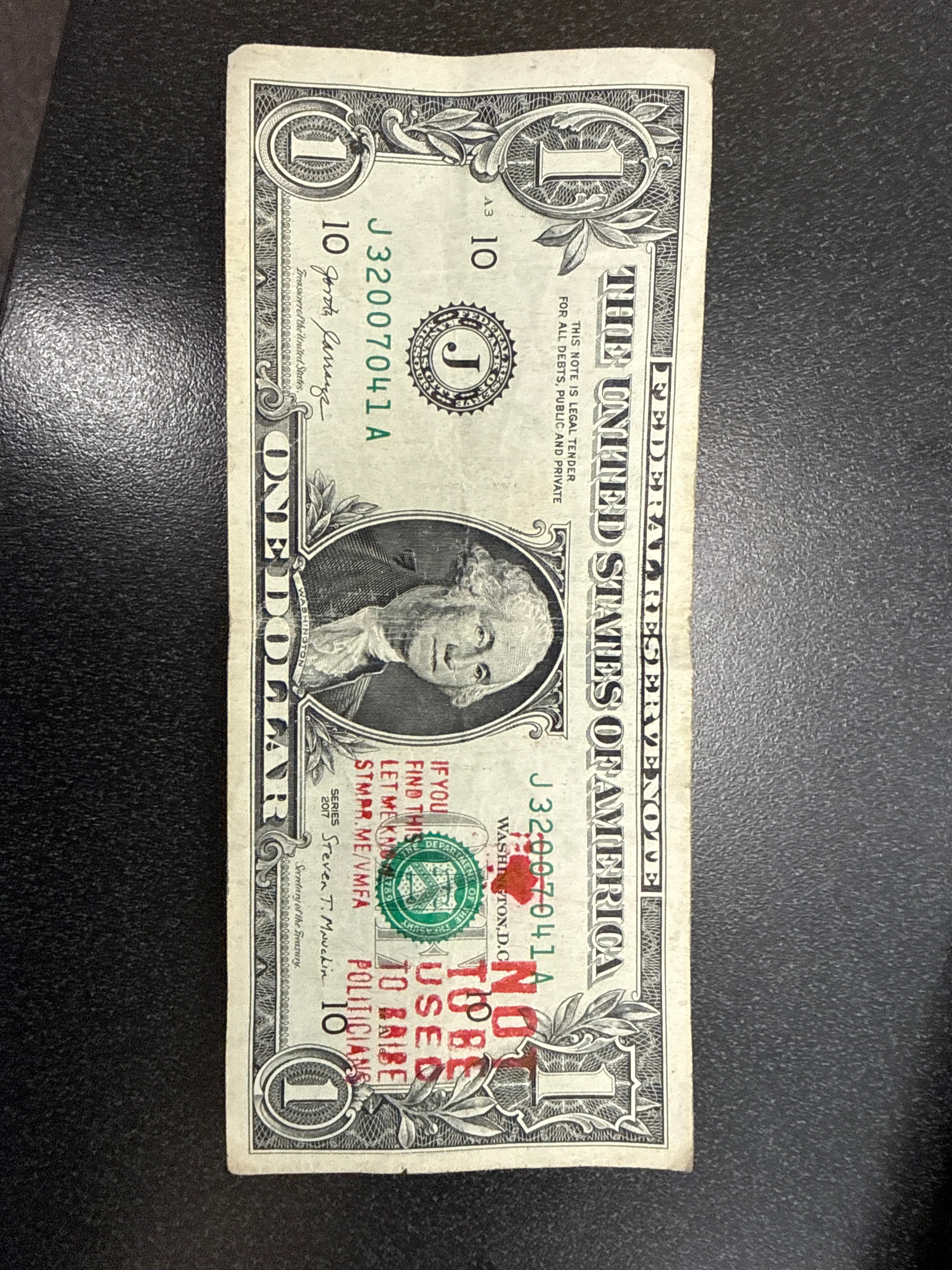 | 2/27/2026 | Valley Park, MO | my friend dakota was paying me 25$ for the laundromat and he said “look at this bill it’s stamped, read it.” and we ended up finding this website and thought it was cool how bills travel | 1 | View Bills |